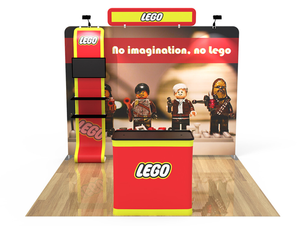 Featuring a blend of a flat tension fabric backwall display, a flat tension fabric header, a tension fabric television banner stand, a podium (with included carrying case), and a duo of LED light fixtures, this unique booth has the ability to engage any audience.