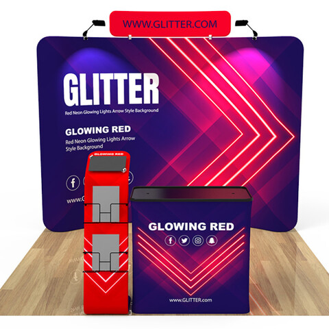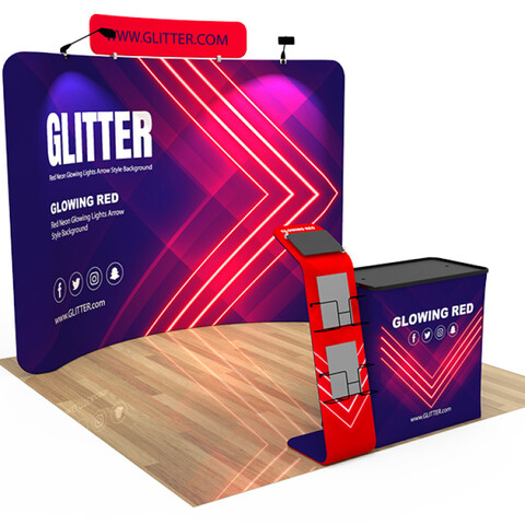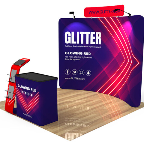 Featuring a blend of a curved and collapsible tension fabric backwall display, a curved flat tension fabric header, a tension fabric iPad, tablet and literature banner stand, a podium (with included carrying case), and a duo of LED light fixtures, this unique booth has the ability to engage any audience.
