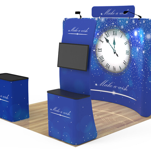 Featuring a curved and collapsible tension fabric backwall display, a curved tension fabric header, a television display table banner stand, a podium (with included carrying case), and a duo of LED light fixtures, this unique booth has the ability to engage any audience.