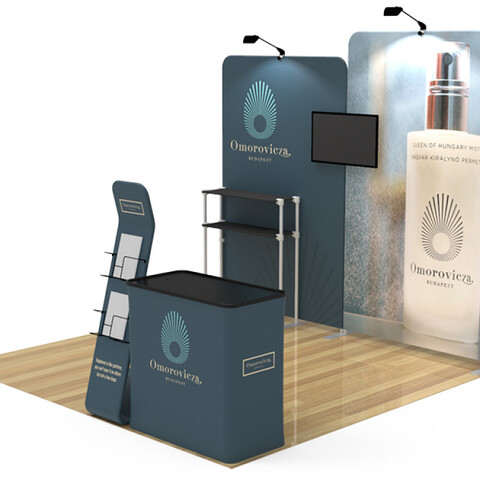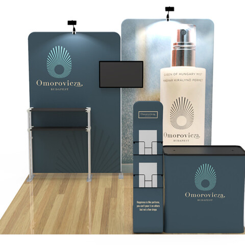 Featuring two flat tension fabric backwall displays, a literature and brochure stand, a podium (with included carrying case), a "shoe-rack" style shelf, a television monitor bracket, and a duo of LED light fixtures, this unique booth has the ability to engage any audience.