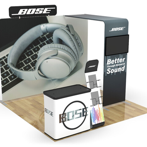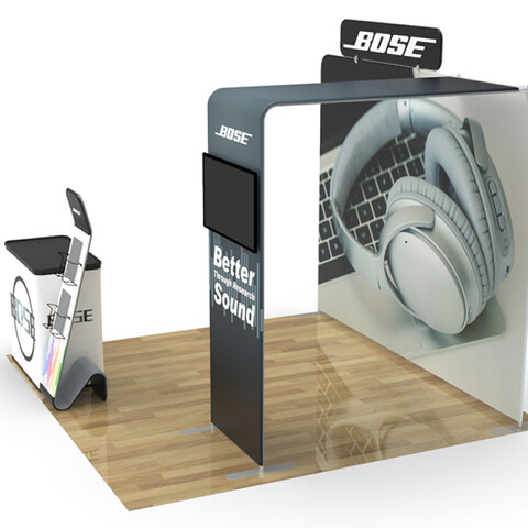 Featuring a flat tension fabric backwall display, a tension fabric header, a literature and brochure stand, a television monitor bracket and display stand, and a podium (with included carrying case), this unique booth has the ability to engage any audience.