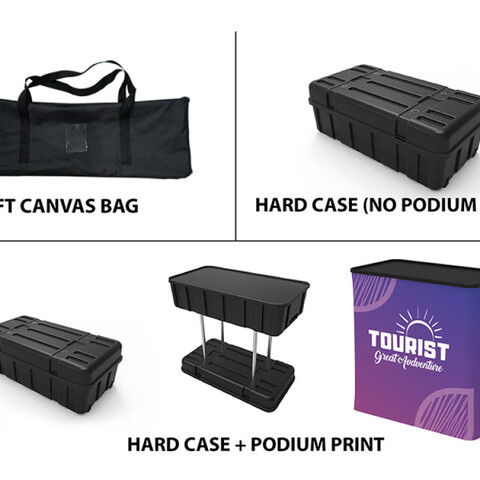 Featuring 1 custom sectorial top tension fabric backwall display, 2 curved top tension fabric backwall displays, 2 monitor brackets, 4 trade show display LED lights and light clips, 2 tension fabric shelving kits, 1 tension fabric iPad, tablet and literature banner stand, and 1 hard case to podium printed graphic, this booth has the ability to engage any audience.