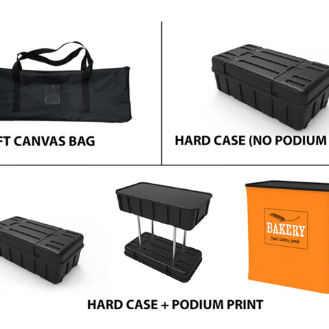 Featuring 1 custom flat and durable tension fabric trade show backwall display, 2 custom curved top tension fabric backwall displays, 1 oval tension fabric header, 1 hard case to podium with custom printed graphic, 4 trade show display LED lights and light clips, 1 monitor bracket, 1 shoe rack shelving kit, 1 triangular display tower counter with custom graphic and 1 snakelike/serpentine brochure and literature banner stand, this booth has the ability to engage any audience.