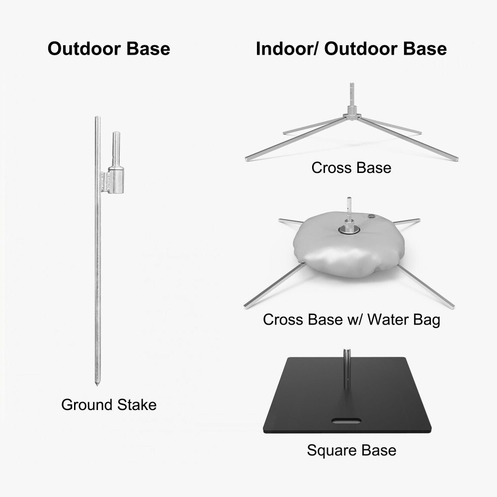 The standard ground stake can be used to install in soft ground, while the cross base or square base are heavy duty for hard surface staging. The optional carry bag is great for when you plan to travel with or store your flag.