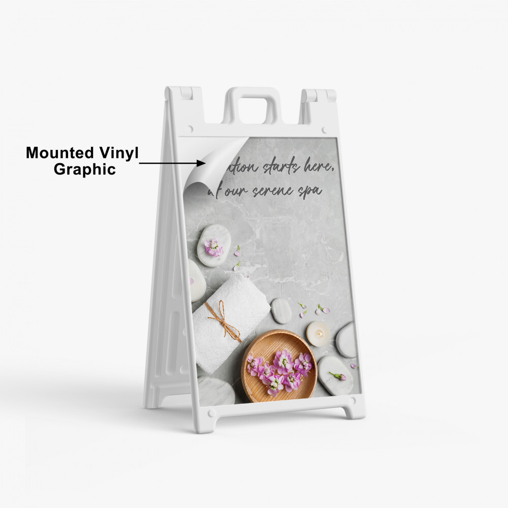 This heavy-duty plastic A-frame is the perfect solution for sidewalk advertising. The frame can be filled with sand or water for greater stability. The hardware includes recessed sign areas that help to protect the vinyl sign faces. Available single sided (front graphic) or double sided (graphics front and back), prints are UV printed on adhesive vinyl and mounted to the Signicade before shipping.