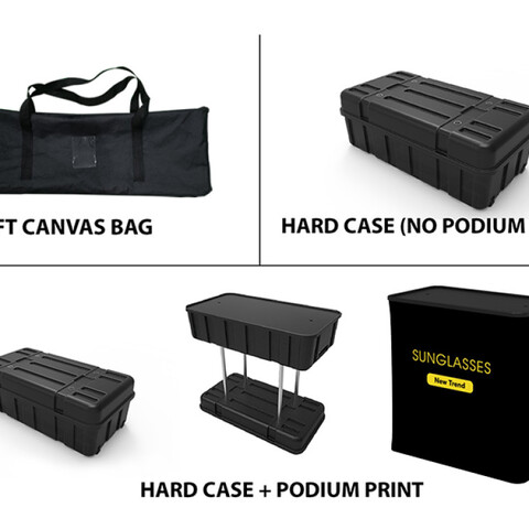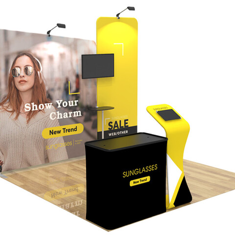 Featuring a blend of an angled tension fabric backwall display, a flat tension fabric backwall display, a television monitor bracket, a tension fabric shelf, a tension fabric iPad and tablet banner stand, a podium (with included carrying case), and two LED light fixtures, this unique booth has the ability to engage any audience.