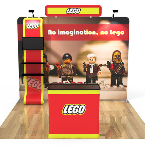 Featuring a blend of a flat tension fabric backwall display, a flat tension fabric header, a tension fabric television banner stand, a podium (with included carrying case), and a duo of LED light fixtures, this unique booth has the ability to engage any audience.