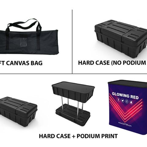 Featuring a blend of a curved and collapsible tension fabric backwall display, a curved flat tension fabric header, a tension fabric iPad, tablet and literature banner stand, a podium (with included carrying case), and a duo of LED light fixtures, this unique booth has the ability to engage any audience.