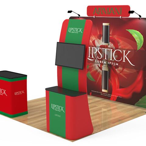 Featuring a blend of a flat tension fabric backwall display, a flat tension fabric header, a television display table banner stand, a podium (with included carrying case), and two LED light fixtures, this unique booth has the ability to engage any audience.