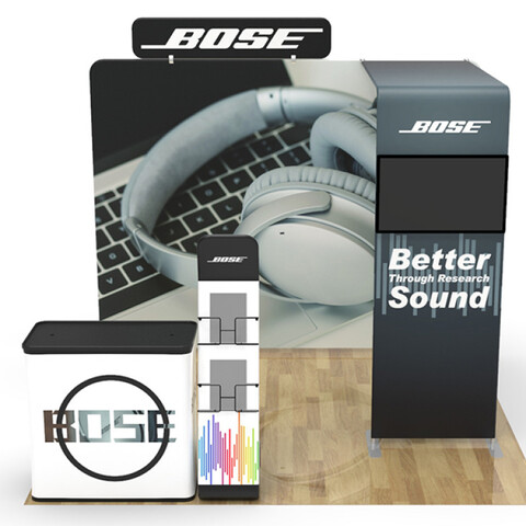 Featuring a flat tension fabric backwall display, a tension fabric header, a literature and brochure stand, a television monitor bracket and display stand, and a podium (with included carrying case), this unique booth has the ability to engage any audience.