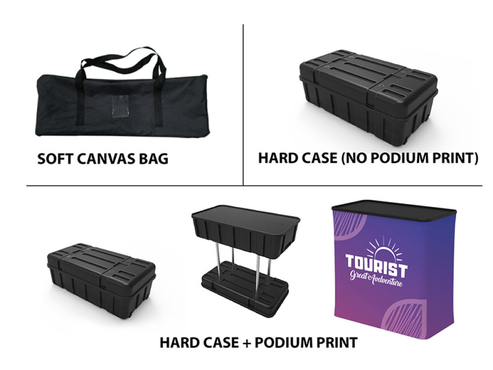 Featuring 1 custom sectorial top tension fabric backwall display, 2 curved top tension fabric backwall displays, 2 monitor brackets, 4 trade show display LED lights and light clips, 2 tension fabric shelving kits, 1 tension fabric iPad, tablet and literature banner stand, and 1 hard case to podium printed graphic, this booth has the ability to engage any audience.