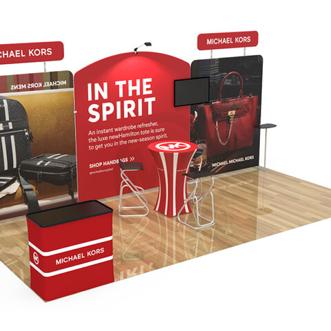 Featuring 2 custom flat tension fabric backwall displays, 2 custom flat tension fabric headers, 1 monitor brackets, 2 tension fabric shelving kits, 1 custom higboy bar height cocktail table, 1 hard case to poduim with custom printed graphic, 1 tension fabric iPad, tablet and literature banner stand, and 1 tade show display LED light and light clip, this booth has the ability to engage any audience.