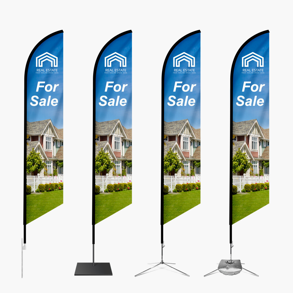 Feather Angled Flags tower over the competition—take advertising to new heights with these full color skyscrapers. With several base options they can be displayed indoors and outdoors.