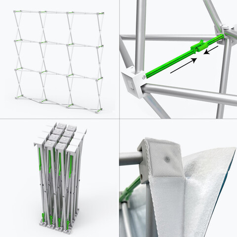 The pop-up display is so quick and easy to assemble with its pop-up mechanism. Dye sublimated tension fabric graphics come with sewn on velcro that attaches to velcro on the accordian style frame. The graphics wrap onto the side profile of this display for full coverage endcaps.